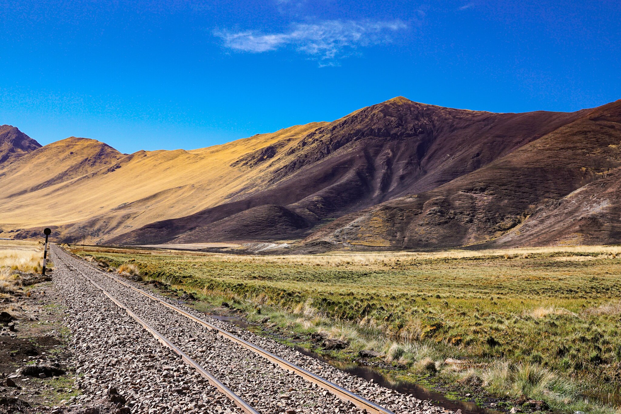 Also dann! Aufbruch in Aguas Calientes mit den ersten Sonnenstrahlen gegen 7:30 Uhr. Nur weg von diesem Ort nervenaufreibenden Treibens… Fröhlich den Pass absolvierend denke ich noch: „Hach, einfach mal schön entspannt dem Titicacasee entgegenrollen… Wetter passt, Strecke passt, und wenn es langweilig wird, gibt es immer noch Musik auf die Ohren.“ Tja, man soll sich seiner Sache nicht so sicher sein. Vorsicht ist bekanntlich die Mutter der Porzellankiste! KNALL, BUMM, BÄNG!!! Mister Muttons Fahrrad liegt auf der Fahrbahn, nachdem der Mister gekonnt (das soll abermals angemerkt sein!) zum Hammelsprung ansetzte! Wieso bauen die Peruaner Eisenbahnschienen in solch dämlichem Winkel zur/über die Straße und lassen dann noch so viel Platz zwischen Straßenbelag und Gleis, dass man ganze Hammelherden darin verstecken könnte?!? Das Hinterrad nahm sich eben dieses Platzes an und sorgte für den Crash des Tages! (Natürlich könnte man auch fragen: “ Warum fährt der dämliche Hammel eigentlich diagonal über die Gleise?!“ Tja, er glaubte nicht an Karma, sondern an seine Skills. SELBER SCHULD :-)!)