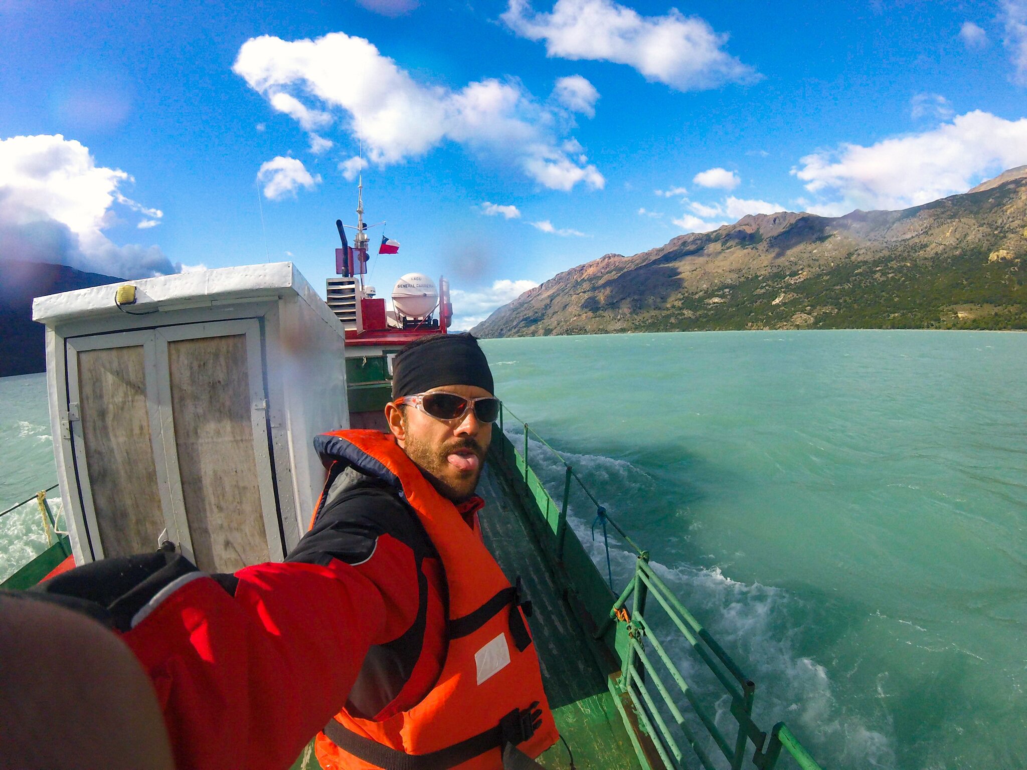 Also ran an den Speck, Argentinien wartet. In O’Higgins organisieren wir bei Lorenzo eine 3,5stündige Fährüberfahrt für unschlagbare 30.000 chilenische Pesos pro Person. El Capitan macht einen leicht windigen Eindruck, genau wie das Wetter des nächsten Tages… Ob das mal gut geht?! Jedenfalls ist er der Einzige, der an diesem Vormittag die Reise antritt, andere Skipper raten von dem Trip ab bzw. stechen gar nicht erst in See. Mister Mutton kennt keine Kompromisse und schmeißt sich gleich eine Stunde vor Abfahrt ne Pille ein! – Keine Macht den Drogen! – Aber eine Reisetablette ist hier die Devise!